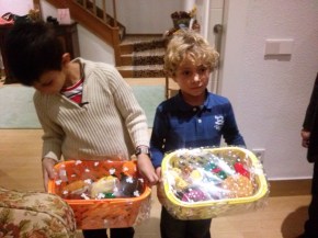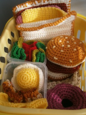 Estas cestas son para los chicos, llevan hamburguesa completa, perrito caliente, sandwich, donuts y helados